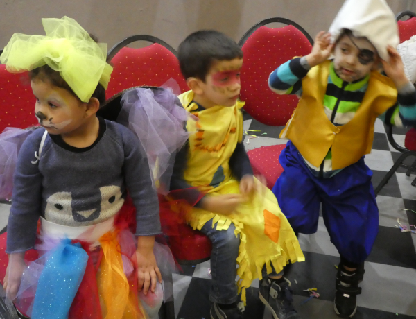 Au rythme des sabots sur le sol et des grelots, ils sont partis pour nous ramener le printemps. Pendant ce temps, d’autres préparaient masques et costumes pour défiler en fin de semaine. Comme les enfants et adolescents de Notre Coin de quartier que nous retrouvons ce vendredi soir. C’est dans la grande salle, à l’abri de la pluie, que nous retrouvons des mamans, deux papas venus découvrir tout en musique le travail réalisé par les enfants des tout petits aux plus grands durant cette semaine de stage.